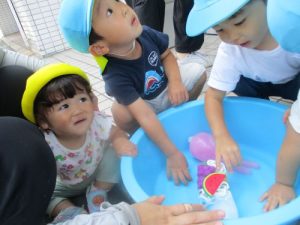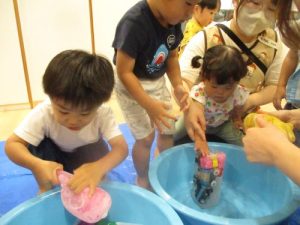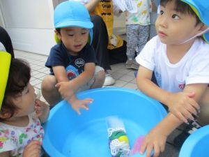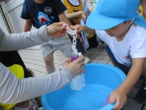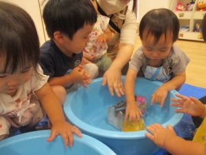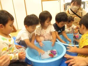 氷だけでなく氷水にも触れて、手や足にペタペタペタ😁🩵