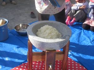 お餅つきの前に、「おもちのきもち」の絵本を読みました。絵本を読み終わると「私達もぺったんするの?」とワクワクがとまりません。