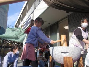 みんなで「よいしょ!」の掛け声とともに順番にお餅をつきます。