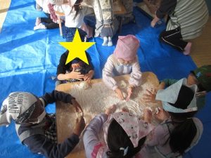 お餅つきの前に、「おもちのきもち」の絵本を読みました。絵本を読み終わると「私達もぺったんするの?」とワクワクがとまりません。