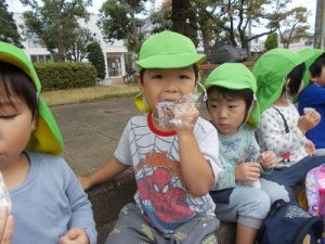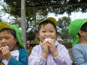 たくさん遊んだ後はみんなでおにぎりを食べました。