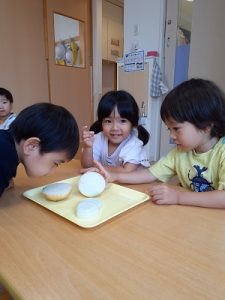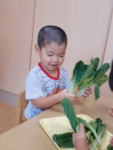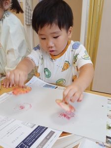 ふじ組 食育活動 「野菜のおなか」 2025/09/01 今回の食育活動は 「野菜のおなか 」について行いました。 切る前の野菜を見て、縦に切った形 横に切った形の違いなどを観察しました。 調理される前の野菜に触れるのは新鮮なようで、みんな興味津々でした。 その後は切ってもらった野菜で野菜スタンプを行いました。 色々な形の野菜を使ってカレーの制作を作りました! 楽しく食育活動が出来ました。