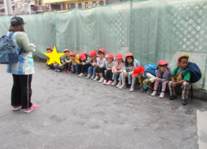 ピクニックの準備をして園庭に集合し、先生から交通ルールの話をした後、いざ!百合台公園へ向けて出発!