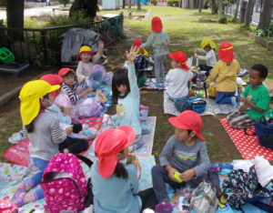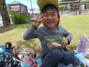 保育園に登園してくると「お弁当、何が入っているの?」「レジャーシートはすみっコぐらし持ってきたよ♪」など、朝からピクニックの話題でもちきりでした。