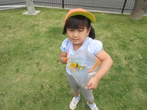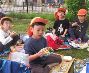 遊んでいる途中から「お弁当、まだ?」とお弁当を楽しみにしていた子ども達、お弁当の声掛けをすると嬉しそうに準備をして、お当番の掛け声でお弁当を食べ始めました。