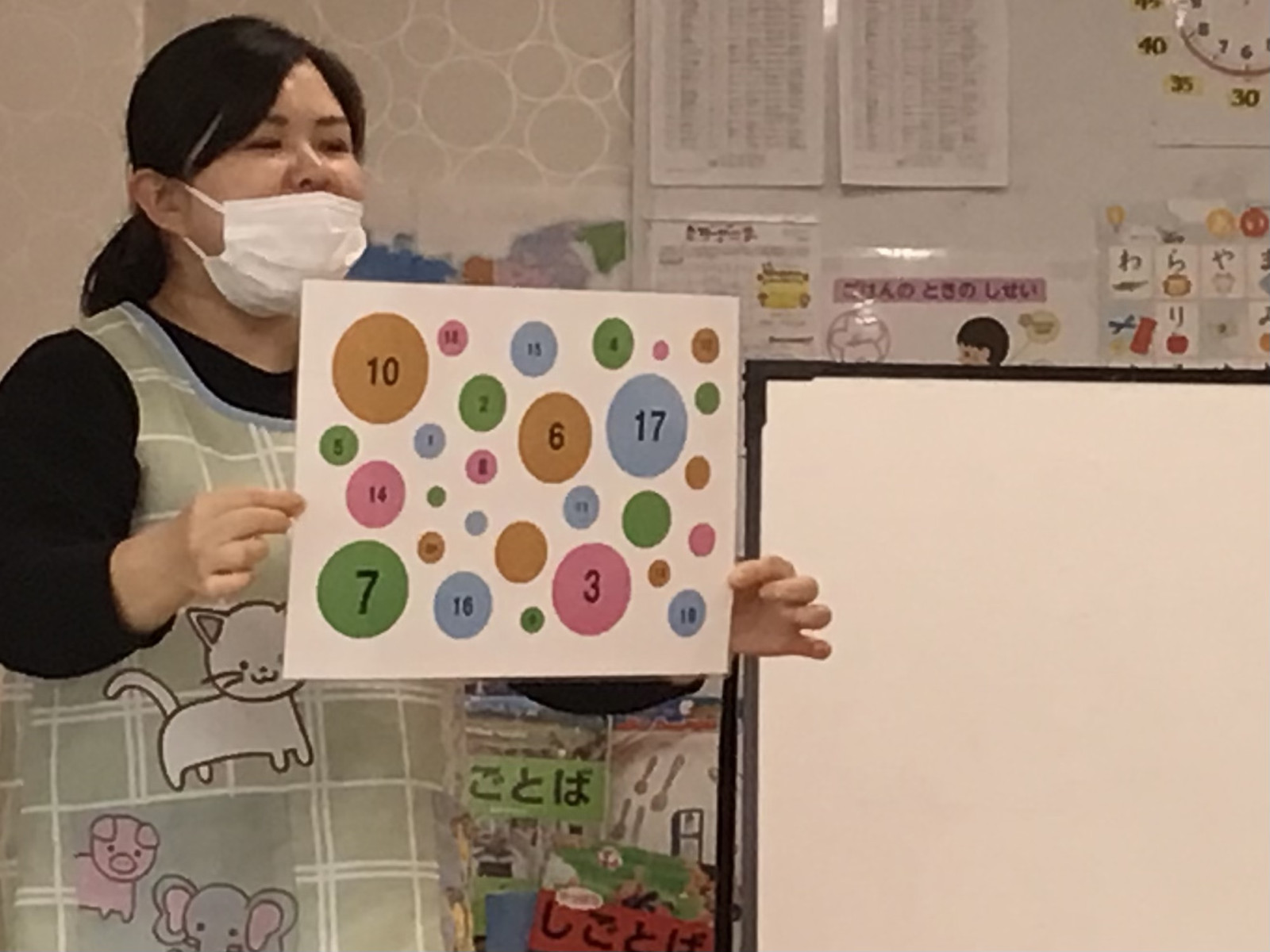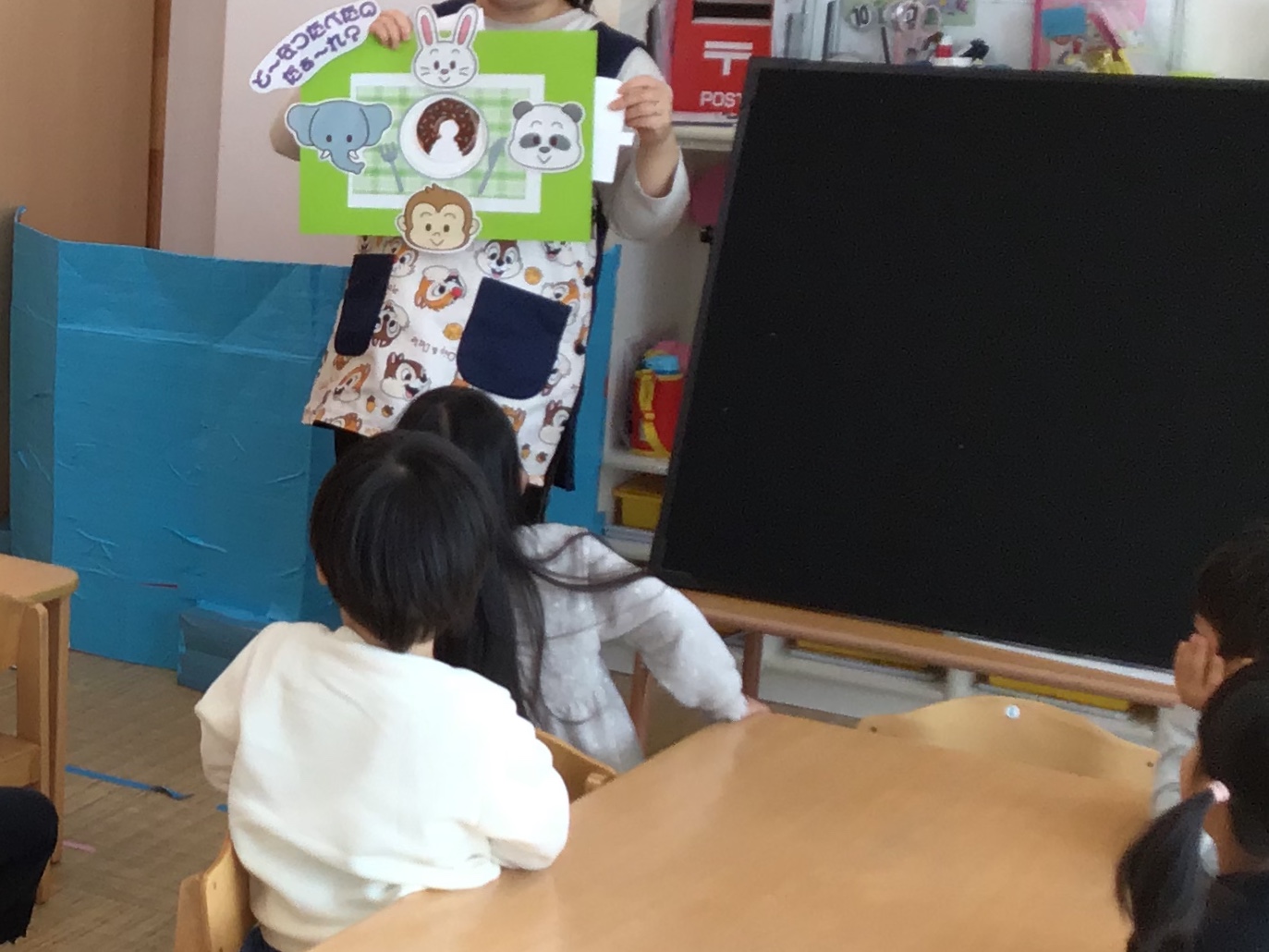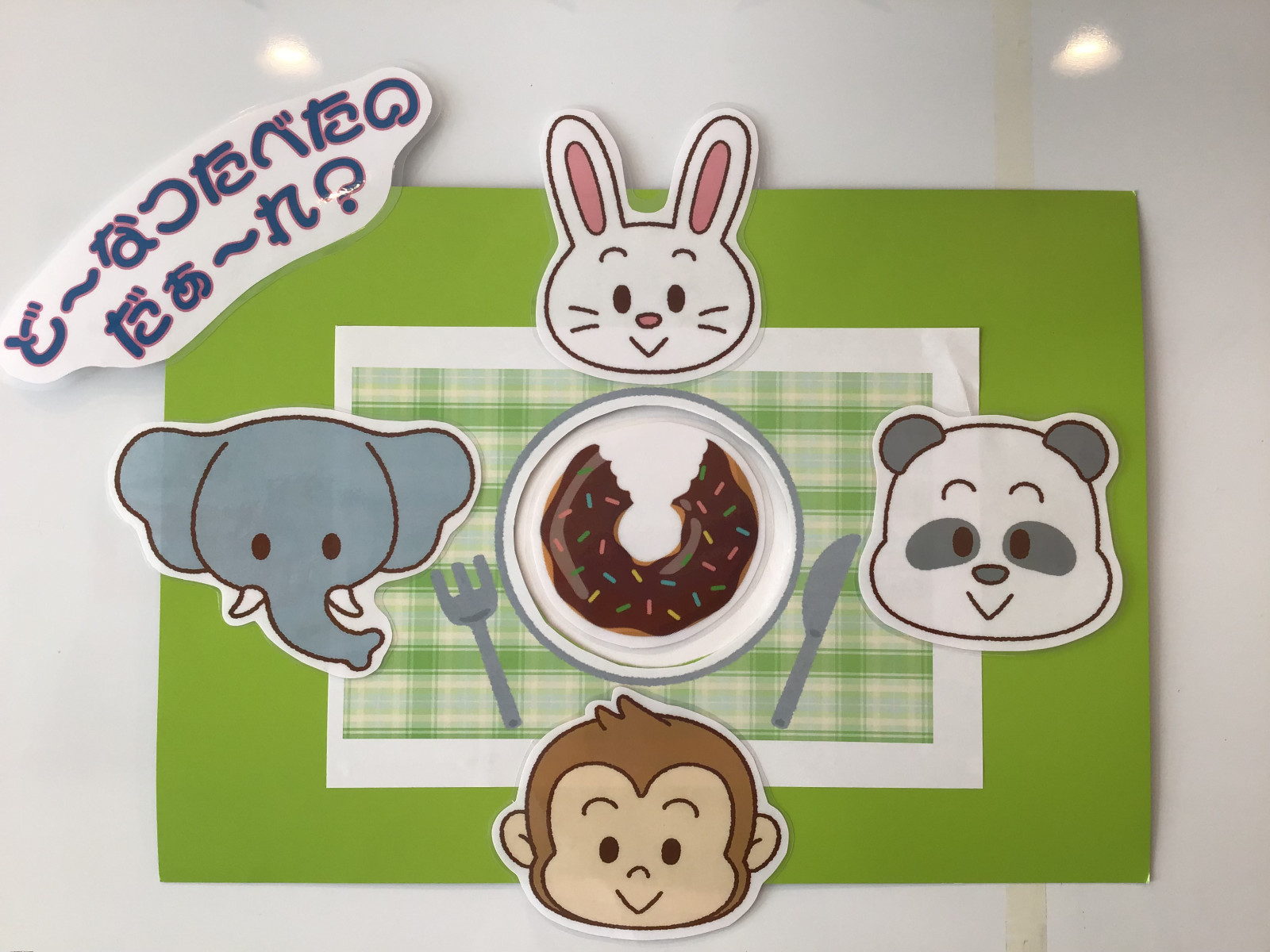 3、4歳児さんは、普段絵本で見慣れている動物やドーナツを使った遊びで、視力検査の疑似体験を行いました。