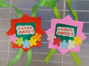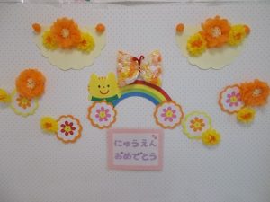すみれ組、ふじ組、ばら組、ゆり組は、ふじばら組のお部屋で、入園進級会を行いました。