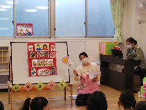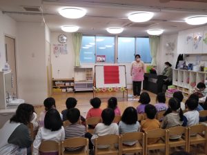 朝のご挨拶をして、カードシアター「今日はうれしいひな祭り」をしました。みんなで協力してひな壇を完成させます。