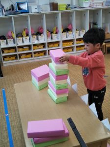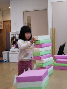 クラス対抗です。菱餅の色の意味を説明し、順番に一人ずつ積み上げます。