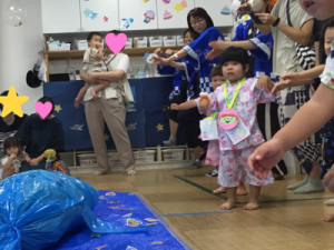ゲームを楽しんでいる間には、ばら・ふじの部屋とたんぽぽの部屋に分かれてそれぞれで、盆踊り『アンパンマン音頭と月夜のポンチャラリン』を楽しみました!