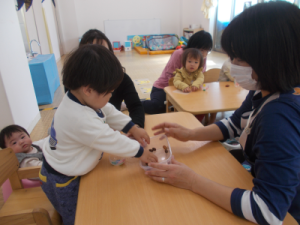 出来上がった、まんまるマラカスを持って、みんなで「どんぐりころころ」を歌いながら、ならして遊びました♫