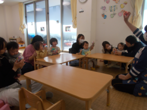 ハンドベルは、ひとり1つ持って。「ドレミの歌」に合わせて、自分のパートで元気よく、ならしてくれました😊