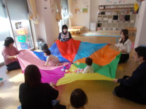 パラバルーンの上に座って、パタパタしてあげると「キャハハ!」とたくさんの笑顔が✨