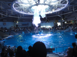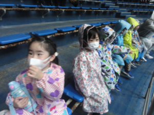 最後はみんなでイルカのショーを見ました。カッパを着て準備万端!