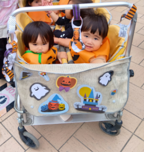 0歳児さんは、ハロウィン仕様になったお散歩カートと職員手作りのかぼちゃの衣装♫