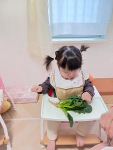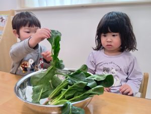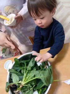 興味津々でほうれん草を触る子供たち!