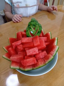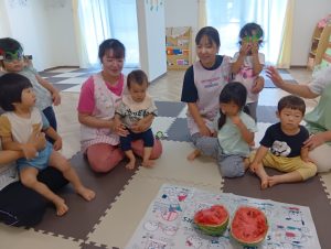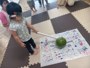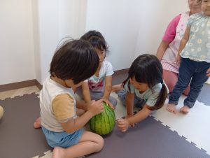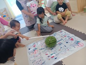 🍚8月の食育🍚 2025/10/15 8月の食育教室はすいか割りをしました。 大きなすいかに興味津々!触ってみたり叩いてみたり転がしてみたりとても楽しそうでした! すいか割りではなんと!子供たちの力ですいかが半分に割れました☺ 先生たちもびっくり! 午後おやつでは、割ったすいかをみんなで仲良く食べました。