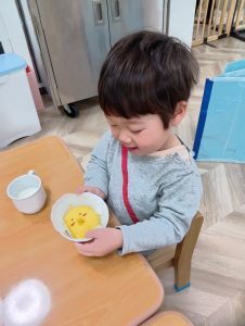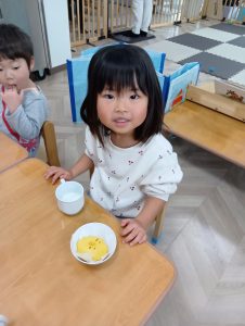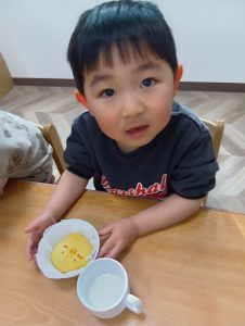 🍰午後おやつ🍰 2026/02/24 今日の午後おやつは、ひよこ蒸しパンでした! 子供たちはいつも「今日のおやつな~に?」と楽しみにしていてくれるのでとても幸せです! ひよこ蒸しパンを見せると「ひよこだ!」と喜んでくれました♡ すみれ組さんはみんなピヨピヨーと言いながら楽しそうに食べてくれました。 これからも子供たちが笑顔になれる給食やおやつを作りたいです✨