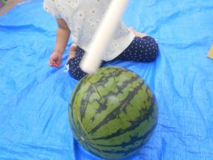 2歳児クラスの子どもたちは、数日前からスイカがあることに気付いていたため、「スイカはやくたべようよ!」「すいかわりしよ~!」と張り切った様子で、スイカ割りに挑戦!スイカが無事に割れると「たべたい!」「おいしそう!!」と食いしん坊な一面を見せてくれました😊