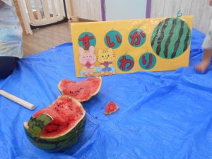1歳児クラスの子どもたちは、スイカの存在に気付くと、すぐに感触を確かめたり、保育者と一緒に順番にスイカ割りを楽しむことができました✨