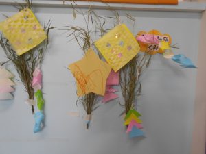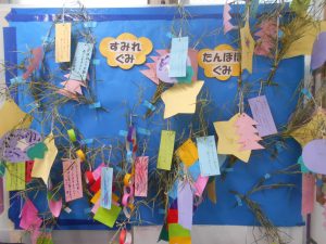 七夕会🎋 2025/07/11 各クラス、2~3種類の七夕飾りを作って、本物の笹に飾りました🎋 七夕会では、【きらきらぼし】の絵本を読むと、1・2歳児クラスの子どもたちが身振り手振りをしたり、歌を歌ってくれたりしました♪ 【みんなのおねがい】という七夕の絵本の読み聞かせでは、2歳児クラスの子どもたちが絵本の内容をしっかり覚えており、「まっくんだ~!」等、登場人物の名前を呼ぶ姿もありました✨ みんなのお願いが叶いますように☆彡