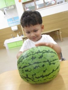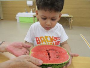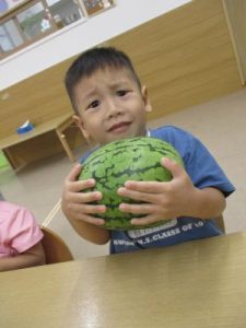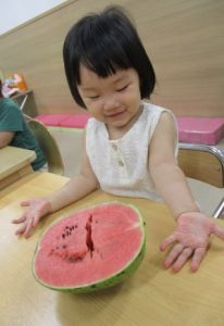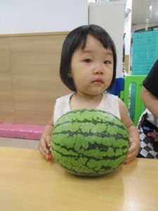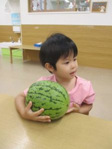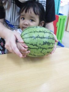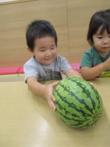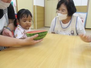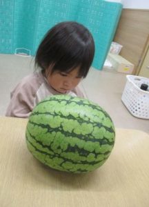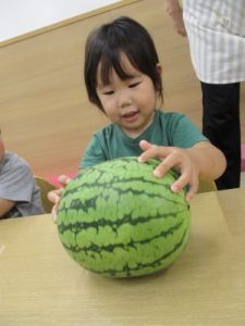 丸くて緑だったスイカが、あれれ?と不思議そうに見つめるたんぽぽ組のお友だち😊