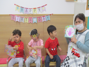お誕生日のお友達の紹介と担任の先生からのバースデーカードのプレゼント🎁