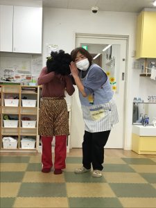 おにさんを見て保育者のもとに一目散に逃げていく姿が・・・