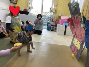 どの子も怖がることなく、豆の代わりにカラーボールを鬼めがけて投げました。
