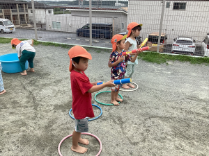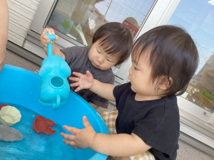 ワニさんに変身したり、水を掛けあったりと全身で水遊びを楽しんでいます