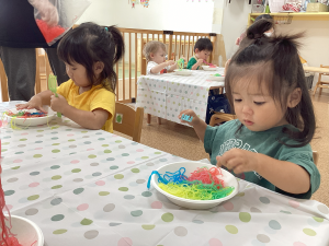 春雨に色をつけて握ったり、フォークを使って持ち上げたりと