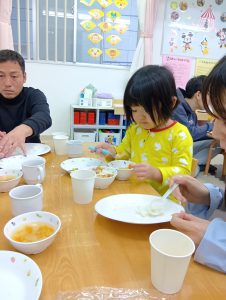 最後は、お給食の時間。おとうさんおかあさんは給食試食会です。