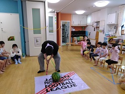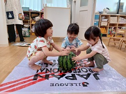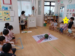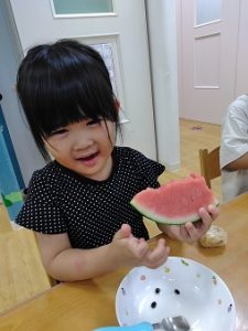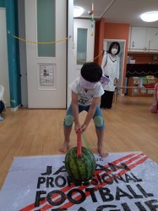 【🍉すいか割りをしました🍉】 2025/07/23 みんなが待ちに待っていたすいか割りをしました🍉 すいかのクイズやすいか割りの由来をきいてからいよいよ本番です! 「がんばれー!」の声援の中、目隠しをして挑戦する子どもたち。なかなか割れずに苦戦しながらも、最後は園長先生も頑張って見事にパかッ!とすいかが割れて大盛り上がり✨ 冷たくて甘いスイカをみんなでおいしくいただきました♪