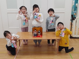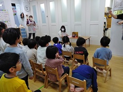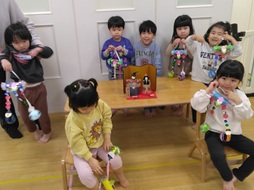 女の子の誕生を祝うひなまつりが行われました。ひな人形の由来を話したあと、クイズを行い、各クラス代表の子どもたちが、自分たちの作品を紹介しました。