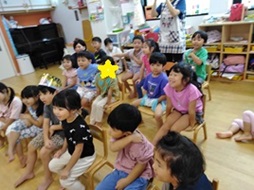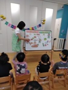 今月の出し物は、【やおやのやーさん】内容は◎✕ゲーム的な内容でした。みんなテレビ番組のクイズのように楽しんでいました。