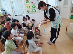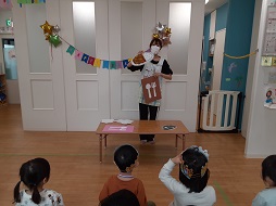 今回の出し物は、不思議な袋に料理の材料を入れると、あらっビックリ!!カレーがでてきたり、最後にはケーキがでてきたりしました!子どもたちはみんな夢中になってみていました(^^♪