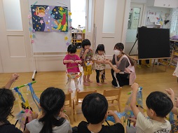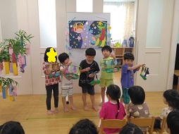 次にふじ組さん、ばら組さん、ゆり組さん、それぞれ作った織姫と彦星の製作を手に持ち、作ったときに頑張ったことを発表しました!お気に入りの自分の作品を持ち、少し恥ずかしそうにしながらも頑張ったことを上手に発表していましたよ♪
