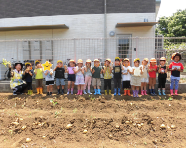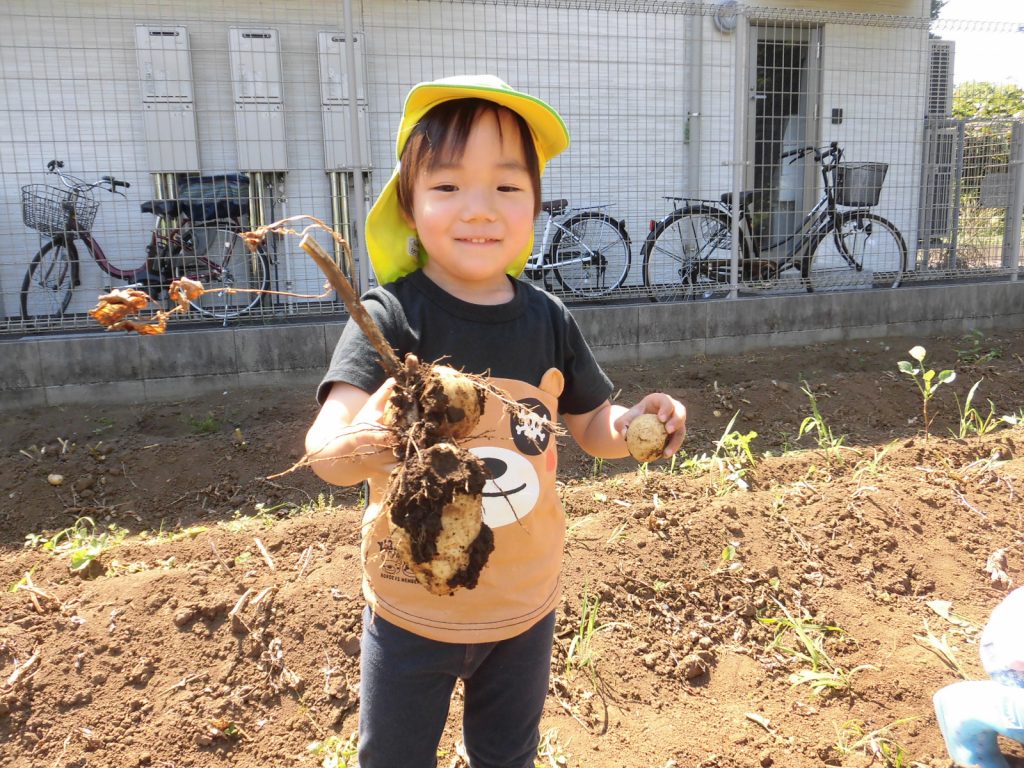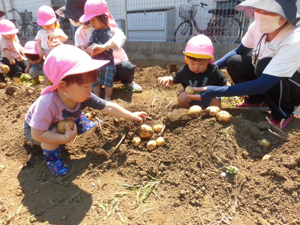 広い畑にビックリ、土の上に座ってドキドキ!畑の土は触ってみてどうだった?ちょっと苦手なお友だちもいたけれど、土を掘ると出てくるじゃがいもが宝物みたいで楽しいね🎶