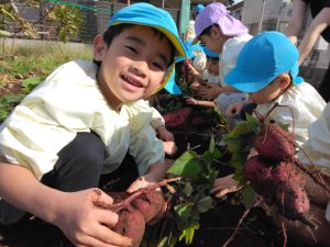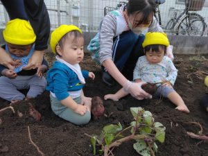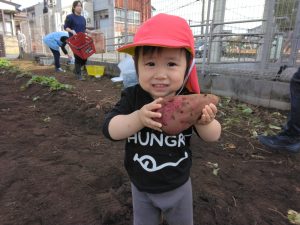 さつまいもほり🍠 2024/11/29 10月末に隣の畑でさつまいも掘りを行いました! 0,1歳児クラスはお兄さんお姉さんが掘ってくれたさつまいもを 触ったり土の感覚を楽しみました☆ 2歳児以上のお友だちは自分たちで掘りました! 大きいお芋や細長いお芋… 様々な形のお芋がでてきました☆ 掘ったお芋は給食やおやつで食べました😋