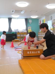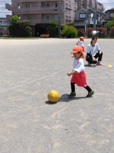ふじぐみ 幼児教室 2025/08/12 向小金園では3歳児クラスのふじぐみになると 幼児教室のサッカーと体操がはじまります!! どちらも月に2回☆ ちょっぴり大きめの体操服♡ サッカーではドリブルをして、シュート!! ※このお写真は春頃のものになります。 現在は暑い日が続いておりますので室内で活動しています。 体操では跳び箱をしたり、縄跳びをつかってみたり…☺ 楽しみながら身体を動かしています!