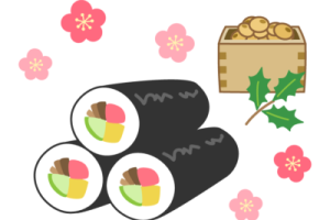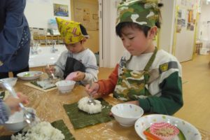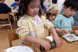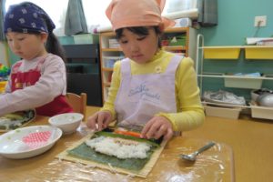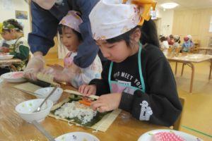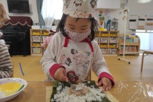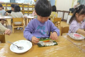 『節分集会』の後にはふじ組・ばら組・ゆり組で「恵方巻」づくりを行いました!初めて見る“まきす”に興味津々。海苔を敷いてご飯を乗せて、ツナやきゅうり、にんじんを乗せたらくるっと巻いて握手の強さ・・・ちょっと難しそうかな?💦でもみんなでやってみよう!