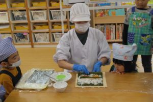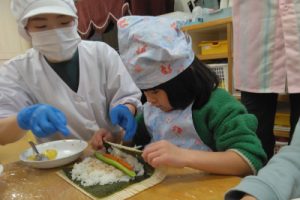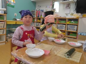 先生にちょっと助けてもらう時もあったけれど、自分で作った「恵方巻」が出来上がりました♪