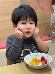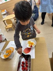 すみれ組のお友だちは好きなフルーツを食べられる分だけ取り、