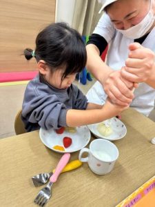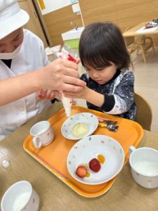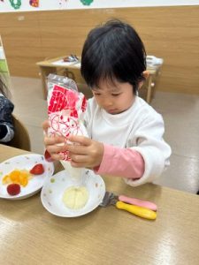 自分で生クリーム絞りにも挑戦!難しいお友だちは先生と一緒に頑張りました❣