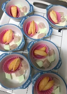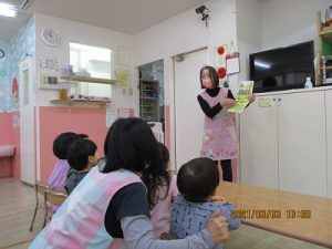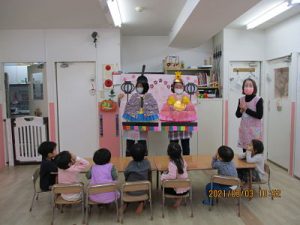 ♪ひなまつり♪ 2021/03/05 3月はひなまつりですね。 新松戸園でひなまつりをお祝いしました。 「ひな人形が遊びに来てくれたよ」とお話ししてから 顔はめパネルのおひなさまが登場。 ひな祭りの絵本を見てから、みんなでおひなさまになりきって 写真を撮りました。 給食は鮭ちらしを おやつはひなまつりゼリーをみんなで食べました。
