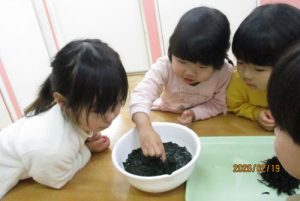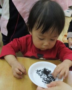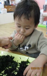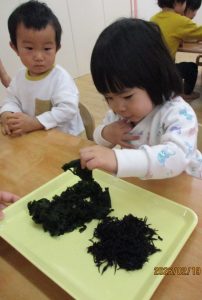 今日の食育はわかめとひじきを観察したり感触を楽しみましたよ!!