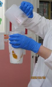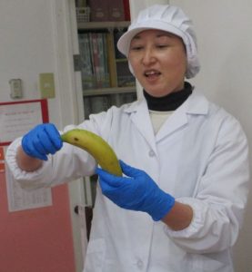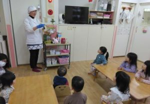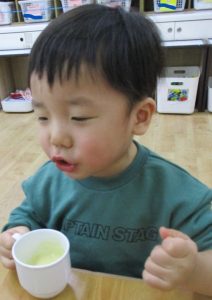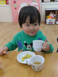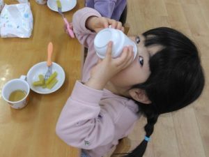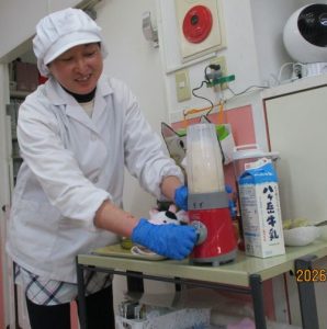 今日の食育はミックスジュースです!調理の先生が🍌と🍊と🍑と牛乳をテーブルに並べてみんな興味津々です✨