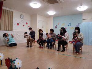 朝の会で手遊びやお名前呼びをしたり、「バスにのって」の音楽に合わせて、おうちの方と楽しい時間を過ごしました。