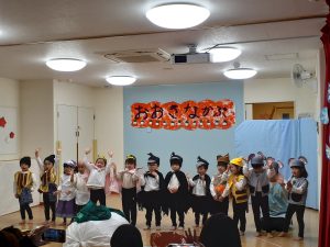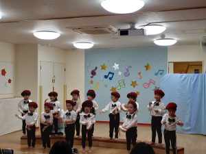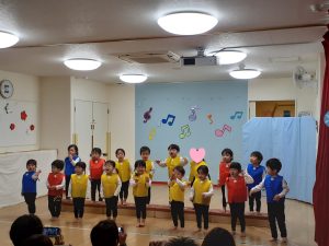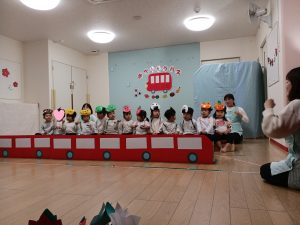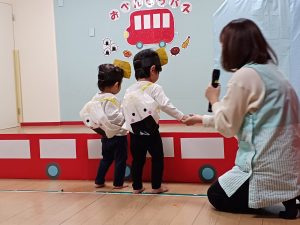 緊張してしまう子が多いふじ組さん。いつもは楽しんでいるけれど、お客さんがいるとドキドキしてしまい固まっちゃうことも、、、。先生たちも「たのしもうね」と声をかけ、挑んだ当日でした。