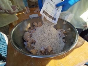 塩や麴など様々な材料を順番に入れて、またよく混ぜていきます。